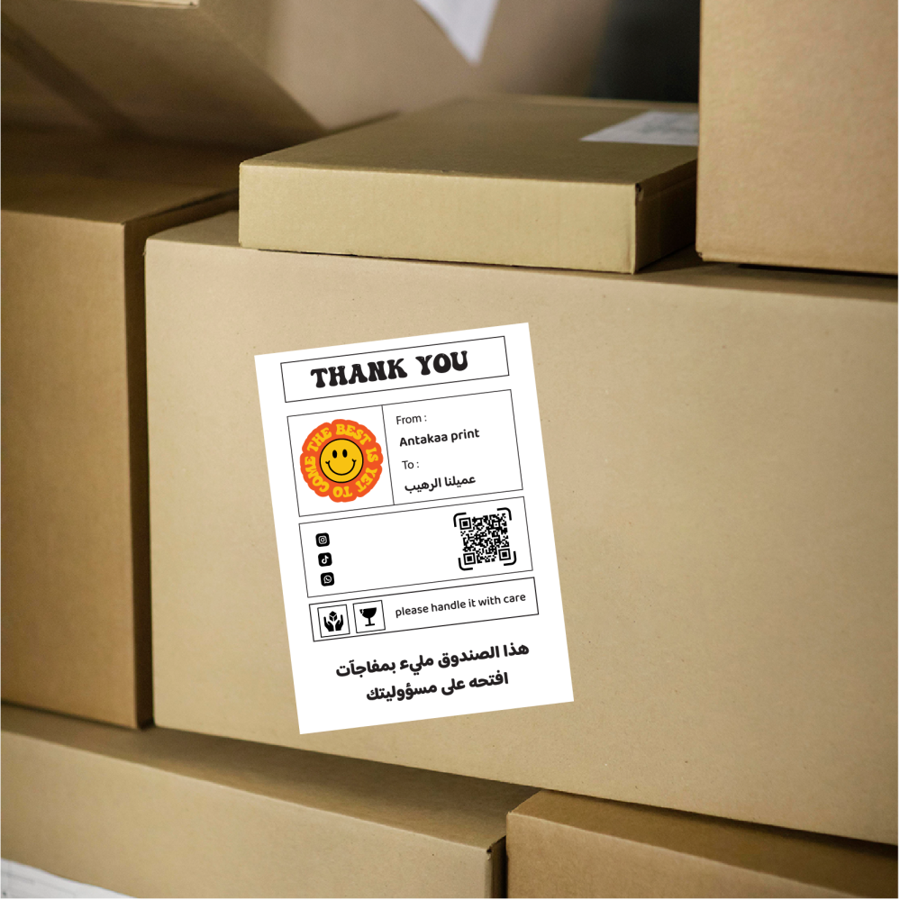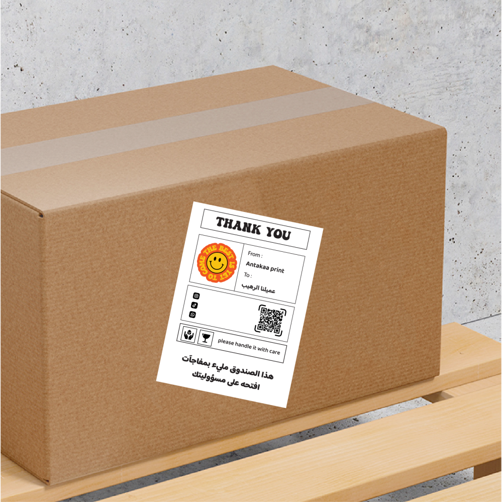 - ستيكر خاص بالشحن الطلبات يمكن استخدامه على الكراتين الشحن او البوكسات او الأكياس او الأظرف